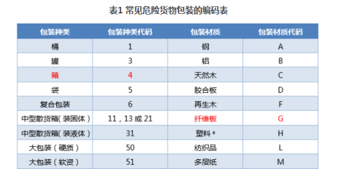 箱博士(無錫市箱博士包裝材料有限公司)依據危險貨物包裝依據材質和種類的不一樣,可以分為很多不同種。為了統一分類和簡化識別,目前國際上統一采用了聯合國TDG法規確定的包裝編碼方法:通過1~2個阿拉伯數字來表示包裝的種類,通過1個大寫的英文字母表示包裝的材質,具體對應關系如表1所示。
