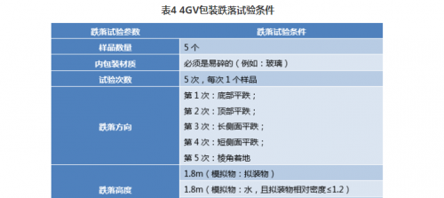 如表4所示,4GV包裝的跌落試驗有兩個特點,一是內包裝必須是采用易碎的內包裝,這無形中對外包裝的設計提出嚴格要求,二是跌落高度采用的是安全等級最高的I類包裝標準。